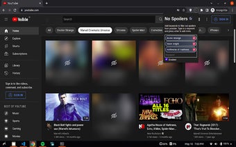 ด้วย No Spoilers คุณสามารถปรับแต่งประสบการณ์การเรียกดู YouTube ของคุณได้ตามความต้องการ แค่เพิ่มคำสำคัญที่คุณต้องการหลีกเลี่ยง และส่วนขยายจะทำการเบลอการ์ดวิดีโอที่มีคำสำคัญเหล่านั้นโดยอัตโนมัติ นี้จะช่วยให้คุณสามารถเรียกดู YouTube ได้โดยไม่ต้องกังวลเกี่ยวกับการพบสปอยเลอร์บนรายการโปรดของคุณ เช่น รายการทีวี ภาพยนตร์ หรือเกมส์